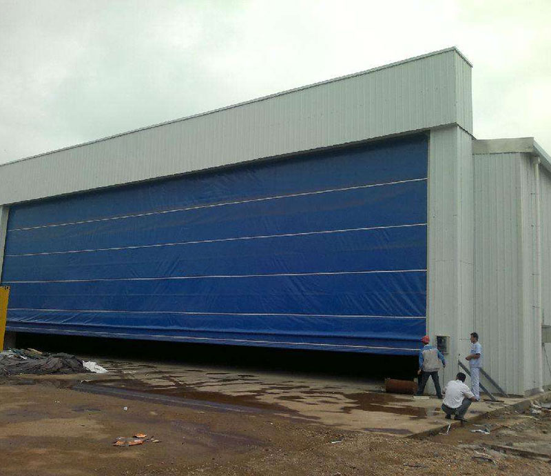 启航彩柔性升降门(堆积式机库门)是一种柔性软帘大门,内外两层门布,门布之间用铝制横梁连接,垂直升降,带有活动导轨,对于顶梁有层次,不在同一直线上的大型厂房和飞机库特别适用。柔性升降门(堆积式升降门)安装在洞口内部,不占用室内空间。开启时门先动,最后叠加到洞口的上方。关闭时,活动导轨先放下,然后门布下降直至完全关闭。